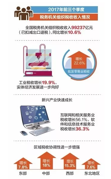 税收收入增长动力较强,反映实体经济发展持续向好。伴随商品价格持续回升,全面推开营改增试点扩大税基、拉长产业链积极效应不断显现,企业生产经营效益明显改善。“今年前三个季度,工业税收增长19.9%,改变了近年来低速增长态势。”税务总局收入规划核算司副司长郑小英说。此外,传统消费行业中的批发零售业税收增长22.6%,体育、教育和文化艺术等服务业税收分别增长45.6%、34.4%和29.8%,反映居民消费结构持续优化升级。