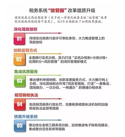 “今年9月,国家税务总局推出了30项改革措施深入推进税务系统‘放管服’改革,进一步优化税收环境。”税务总局征管和科技发展司司长饶立新介绍,这“一揽子”措施涵盖了推进简政放权、创新监管方式和优化纳税服务等方面。