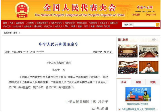 11月4下午,十二届全国人大常委会第三十次会议表决通过了关于修改会计法的决定,修改了“从事会计工作的人员,必须取得会计从业资格证书”的规定,改为“会计人员应当具备从事会计工作所需要的专业能力。”