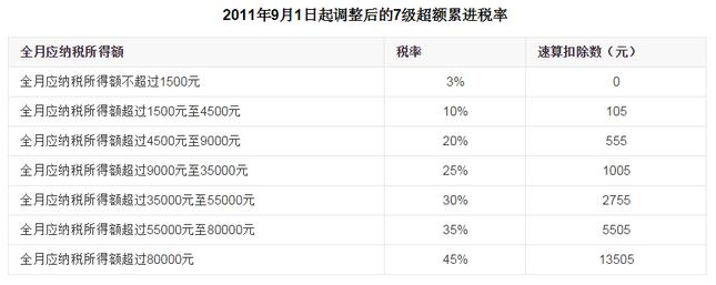 工资、薪金所得,适用7级超额累进税率,按月应纳税所得额计算征税。该税率按个人月工资、薪金应税所得额划分级距,最高一级为45%,最低一级为3%,共7级。