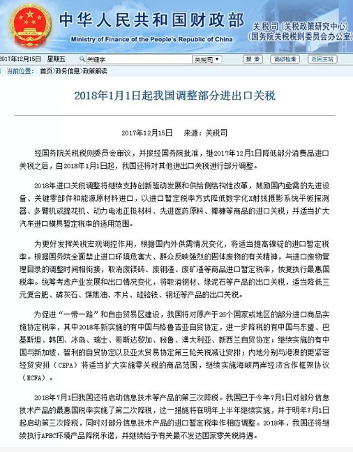 财政部称,统筹考虑产业发展和出口情况变化,将取消钢材、绿泥石等产品的出口关税,适当降低三元复合肥、磷灰石、煤焦油、木片、硅铬铁、钢坯等产品的出口关税。