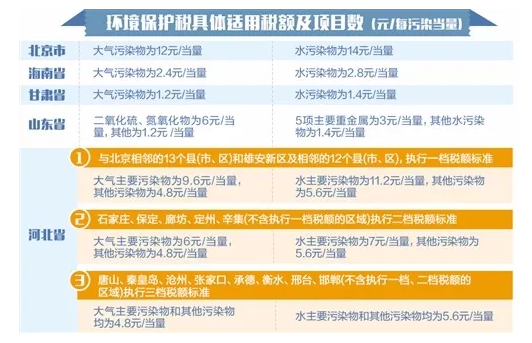 日前,北京市应税大气污染物和水污染物适用税额标准获市人大常委会审议通过,分别为每污染当量12元和14元,按法定幅度“顶格”执行。从目前各地发布的方案来看,环保税税额标准相对较高的有北京、上海、天津、河北、山东等地。以应税大气污染物适用税额标准为例,河北按照国家规定最低标准的8倍、5倍、4倍执行;上海二氧化硫、氮氧化物的税额标准分别为每污染当量6.65元和7.6元;山东二氧化硫、氮氧化物每污染当量6元。