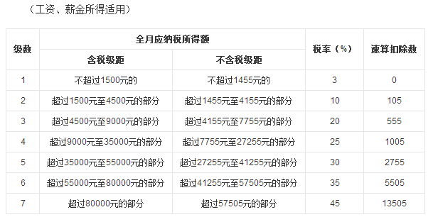 “工资、薪金所得”按月应纳税所得额计算征税。该税率按个人月工资、薪金应税所得额划分级距,最高一级为45%,最低一级为3%,共7级。